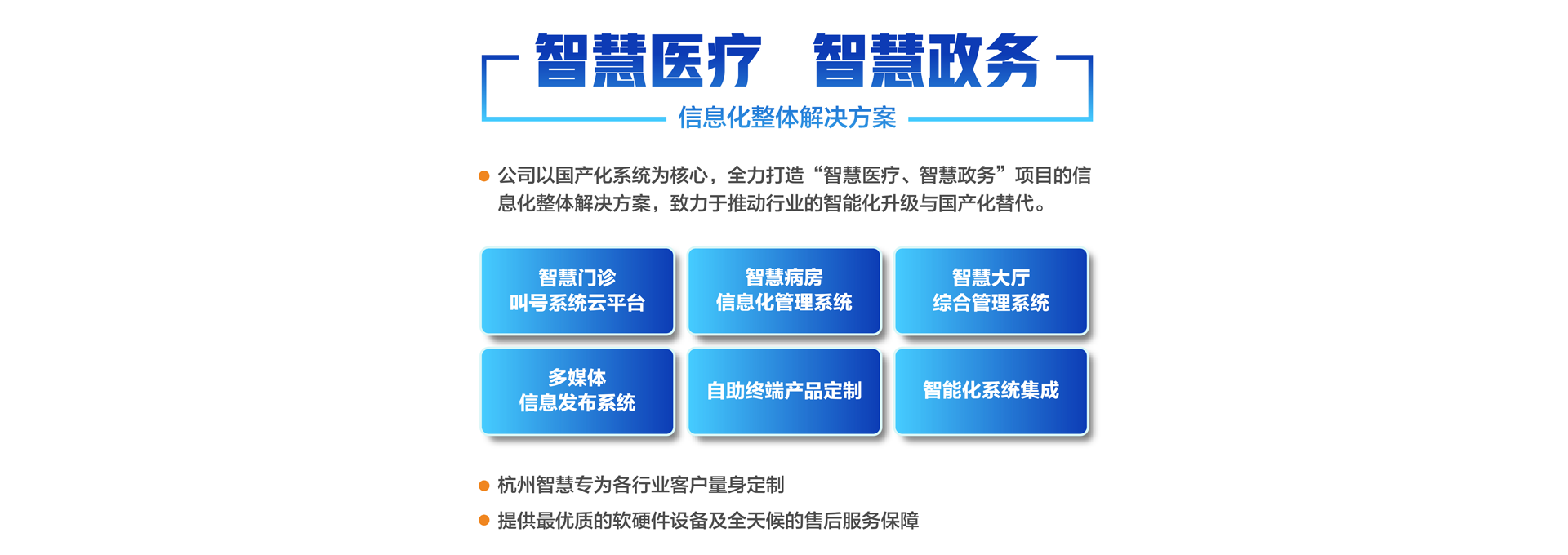杭州智慧科技有限公司初創(chuàng)于2003年,總部位于重要的電子商務中心中國杭州公司主營業(yè)務有:智慧分診叫號系統(tǒng)、智慧病房醫(yī)護對講系統(tǒng)、智慧大廳綜合管理系統(tǒng)、智慧政務管理系統(tǒng)、智慧多媒體信息發(fā)布系統(tǒng)、導診系統(tǒng)及各自助終端產(chǎn)品定制。專為各行業(yè)客戶量身定制。公司已有20余年行業(yè)經(jīng)驗沉淀積累,擁有優(yōu)秀的產(chǎn)品外觀設計師和各類中高級專業(yè)技術工程師,確保所研發(fā)的產(chǎn)品具有行業(yè)領先的外觀及可靠的技術性能。并擁有權威部門頒發(fā)的各類知識產(chǎn)權及專利證書,30多項資質證書、800多個合作伙伴、2000多個項目成功案例經(jīng)驗。 智慧產(chǎn)品已遍及全國各醫(yī)療、政務、金融、通訊、公安、工商、稅務等行業(yè),形成以“立足杭州、輻射長三角、拓展全國”的戰(zhàn)略發(fā)展格局,產(chǎn)品經(jīng)過歷年不斷創(chuàng)新,形成專業(yè)化、平臺化,致力于成為智慧產(chǎn)品的領軍企業(yè)。 公司建立了完善的技術培訓及售后服務中心,并設24小時熱線咨詢電話解答用戶反饋的問題。同時應客戶要求定期派技術人員到 全國各地進行技術指導輔助用戶正確使用智慧產(chǎn)品并能獨立安裝、調(diào)試、日常維護等工作。提供最優(yōu)質的設備及全天候的售后服務保障,智慧永恒不變的服務宗旨——致力于客戶的滿意與成功!...